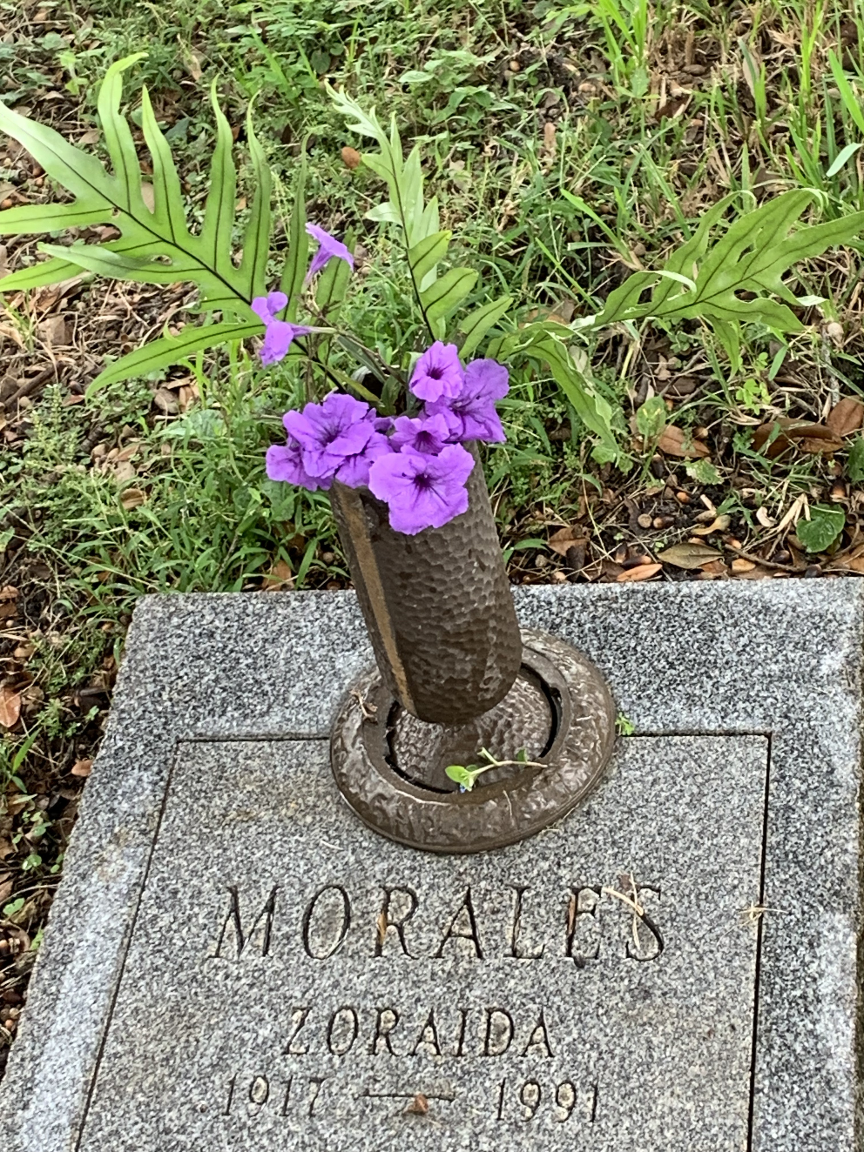 Hoy, 9 de nobiembre, es el día de su cumpleaños, por eso fui a visitarla. Fue hermoso hacerlo. Rumbo al cementerio se me ocurrió recoger flores silvestres por el camino, en vez de complarle rosas amarillas, blancas, rojas o claveles o nardos u otro tipo de flor bella. Manejando empecé a mirar a un lado y otro, nada. Mucho verdor, eso sí, pero difíciles de cortar con las manos por su tallo o arrancar para llevármelas. ¡Ah! Pero me aguardaba una sorpresa preciosa. Ante mí aparecieron las flores lilas que me gustan y se dan silvestres. Detuve el carro y arranqué algunas, las más grandes y saludables. Unas hojas verdes que vi. Limpio la lápida a menudo, pero el tiempo va borrando parte de los textos. Debajo dice: «El Señor es mi pastor, nada me falta.» (Salmo 23).